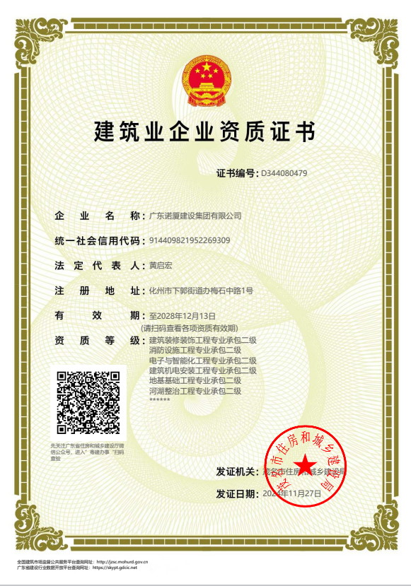 廣東諾廈建設集團有限公司是諾廈集團的核心企業,具備國家房屋建筑工程施工總承包壹級、市政工程施工總承包壹級、港口與航道工程總承包、建筑裝修裝飾工程、消防設施工程、地基基礎工程、機電設備安裝工程、體育場地設施工程、建筑智能化工程、河湖整治工程、水利水電工程等資質。......